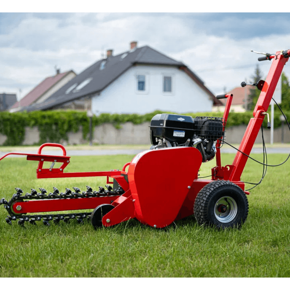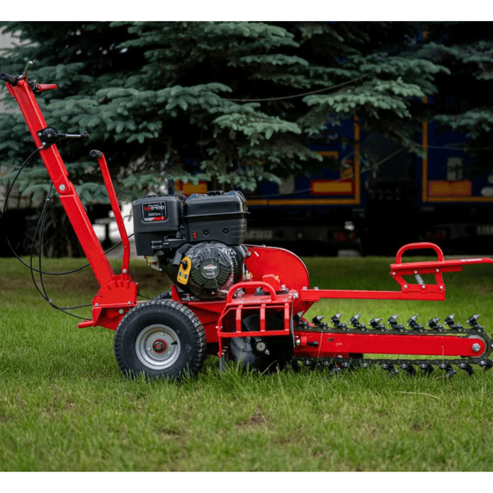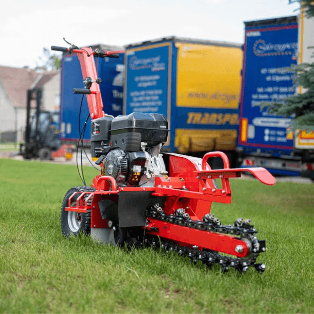 Koparka łańcuchowa ZTE GF170 to wydajna maszyna przeznaczona do wykonywania wąskich i precyzyjnych wykopów pod instalacje. Doskonale sprawdza się podczas układania kabli elektrycznych, rur, systemów drenażowych oraz instalacji nawadniania w ogrodach i na terenach budowy. Dzięki głębokości roboczej do 600 mm oraz szerokości wykopu 100 mm umożliwia szybkie przygotowanie rowów instalacyjnych. Maszyna została wyposażona w mocny silnik Briggs & Stratton o mocy 13 KM, który zapewnia stabilną pracę nawet w twardszym gruncie. Wytrzymały łańcuch z 27 zębami tnącymi pozwala na skuteczne i równomierne kopanie. Kompaktowa konstrukcja oraz stosunkowo niewielka waga 185 kg sprawiają, że urządzenie jest mobilne i wygodne w obsłudze. Duże koła transportowe ułatwiają przemieszczanie koparki po placu budowy.