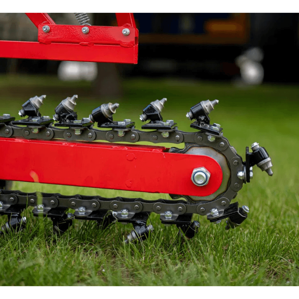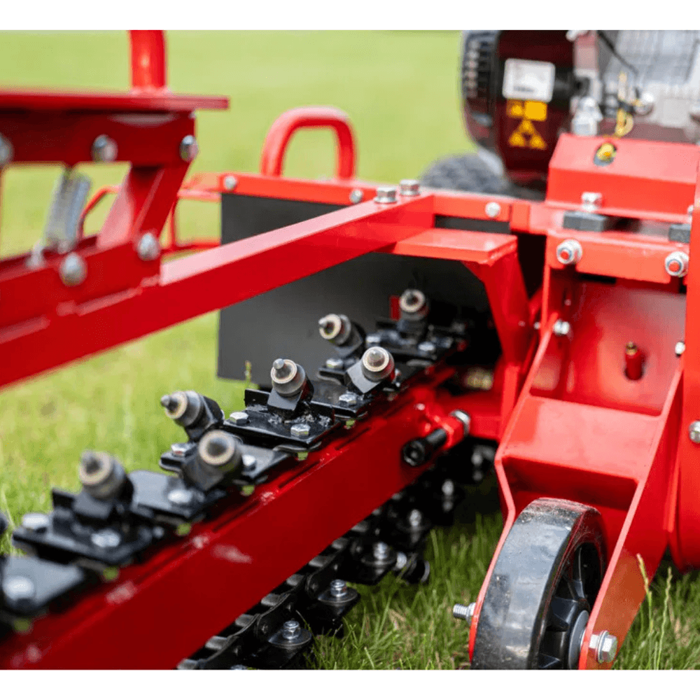 Wytrzymały system łańcuchowy składający się z 54 ogniw i 27 zębów tnących zapewnia precyzyjne i równe wykopy. Stabilna konstrukcja oraz duże koła transportowe zwiększają komfort pracy i ułatwiają przemieszczanie maszyny w terenie.