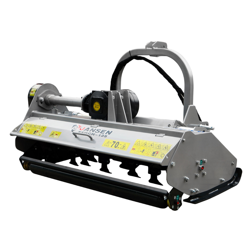 Kosiarka bijakowa Jansen EFGCH-135 to profesjonalny mulczer o szerokości roboczej 132 cm, wyposażony w hydrauliczną funkcję przesuwu bocznego. 24 hartowane młotki po 0,8 kg, wzmocniona przekładnia kątowa i wał podporowy zapewniają efektywne koszenie trawy, krzewów i resztek roślinnych.