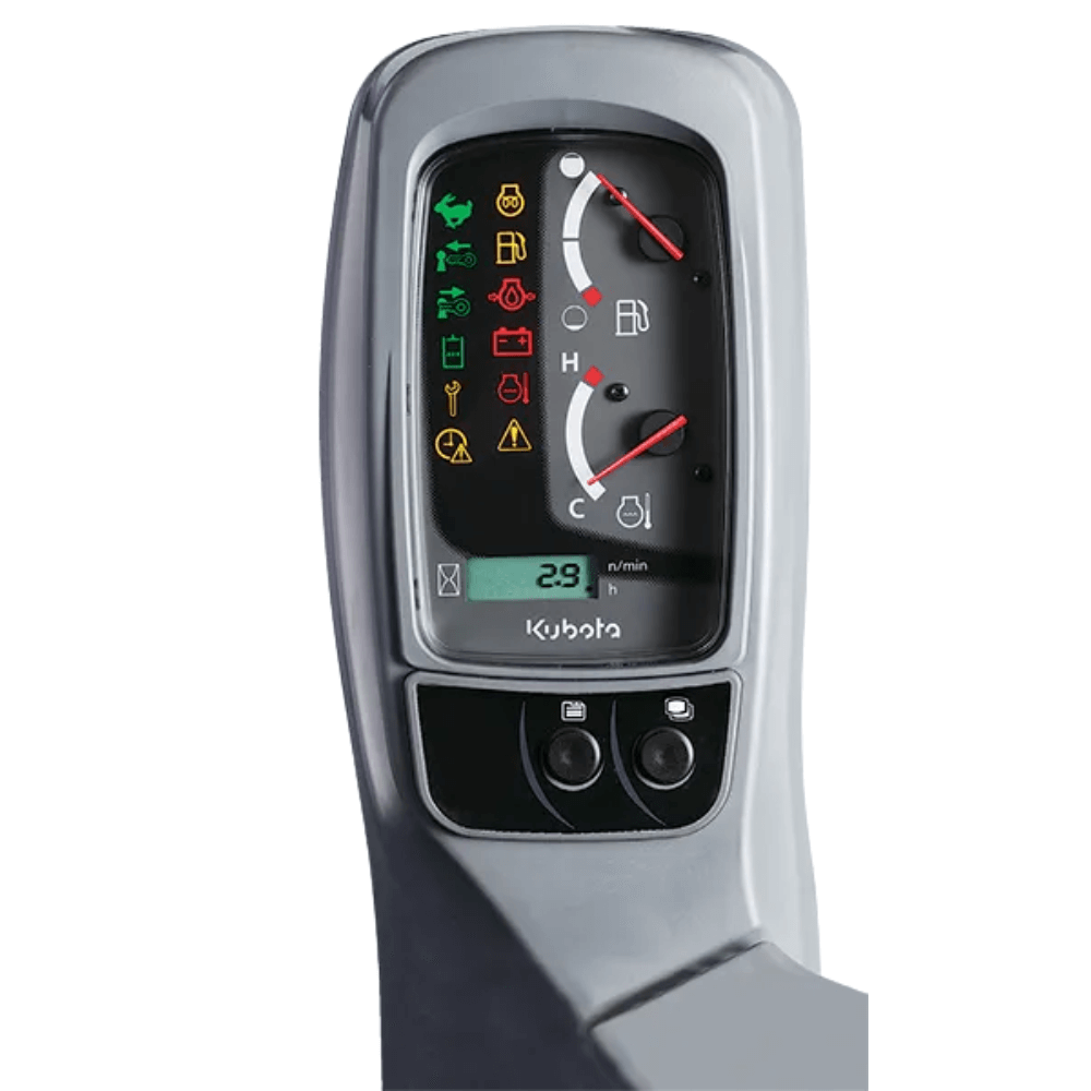 Panel cyfrowy nowej generacji ułatwia monitorowanie pracy i diagnostykę. Wersja Hi Spec wyposażona jest w drugą linię hydrauliczną AUX2 i system Auto Shift.