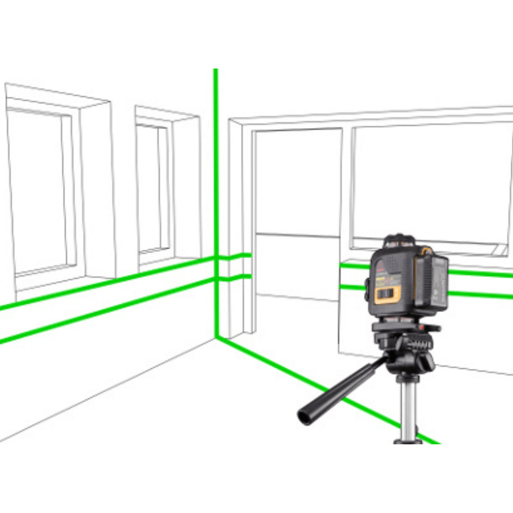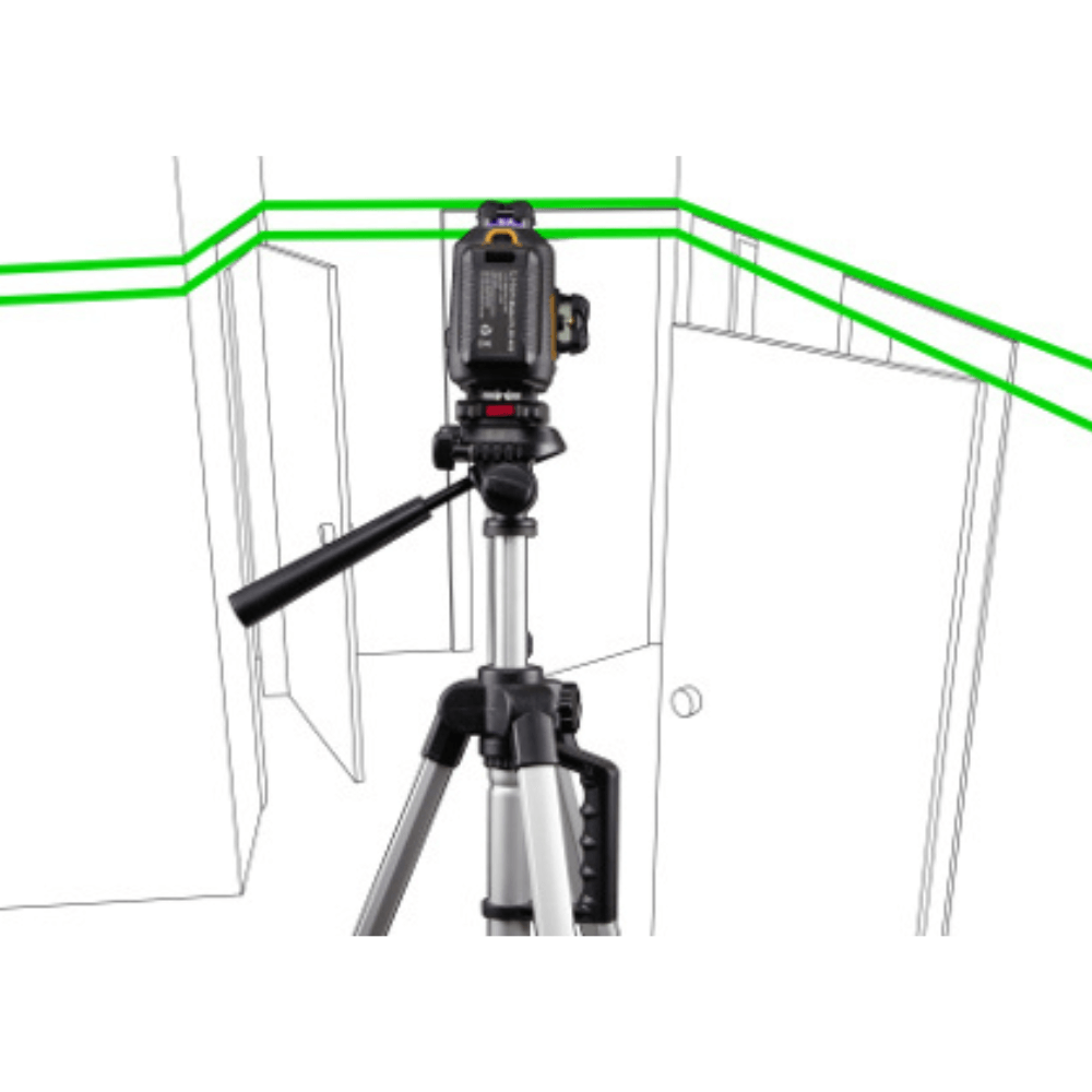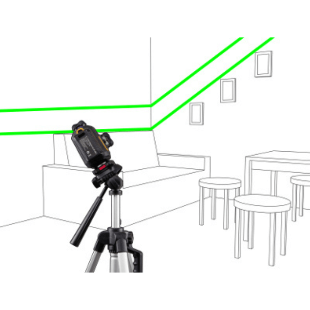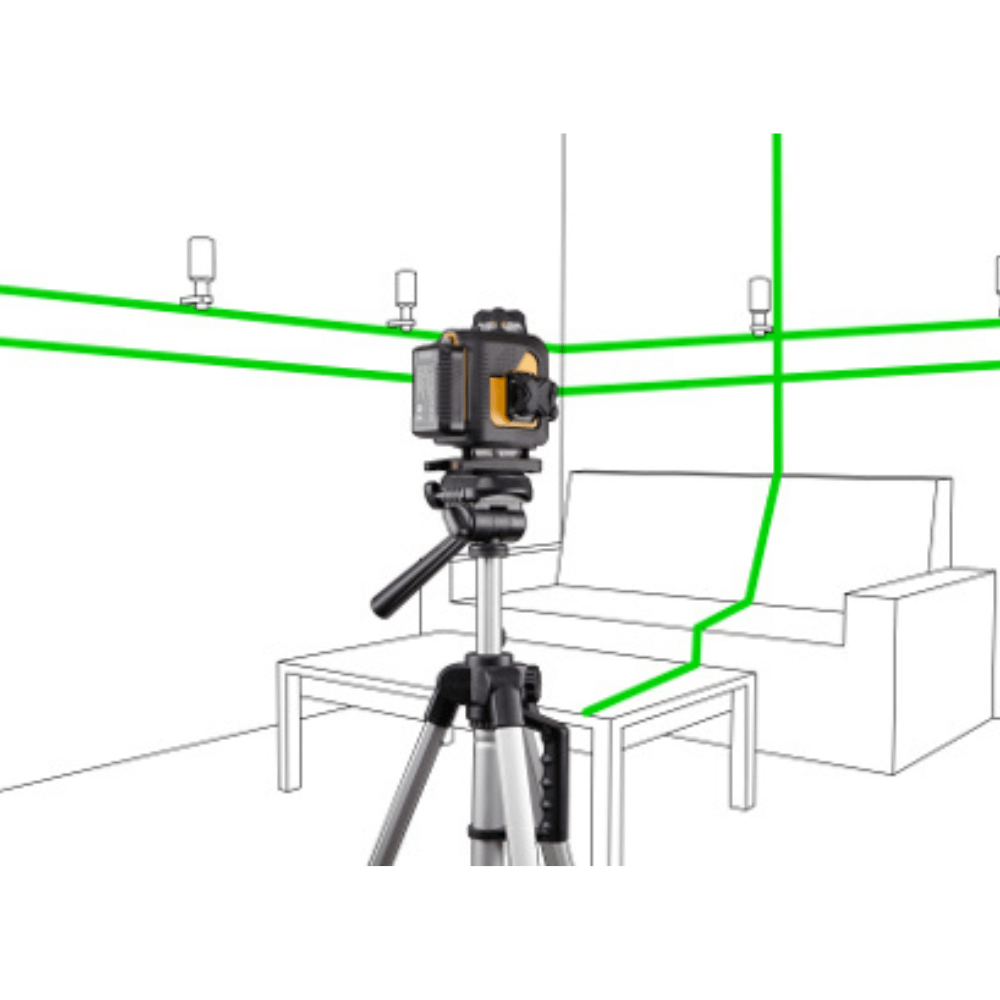 Cztery zielone linie pozwalają jednocześnie kontrolować poziom i pion w całym pomieszczeniu.
