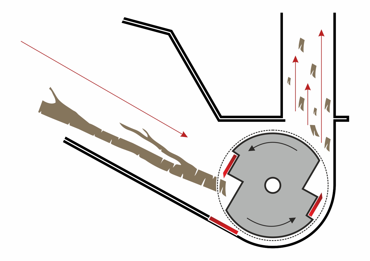 Rębak automatycznie wciąga gałęzie, a dwa obracające się noże wraz z nożem przeciwstawnym gwarantują szybkie i efektywne rozdrabnianie. Wysoka, obracana o 180° rynna wyrzutowa umożliwia wyrzucanie zrębków bezpośrednio na przyczepę..