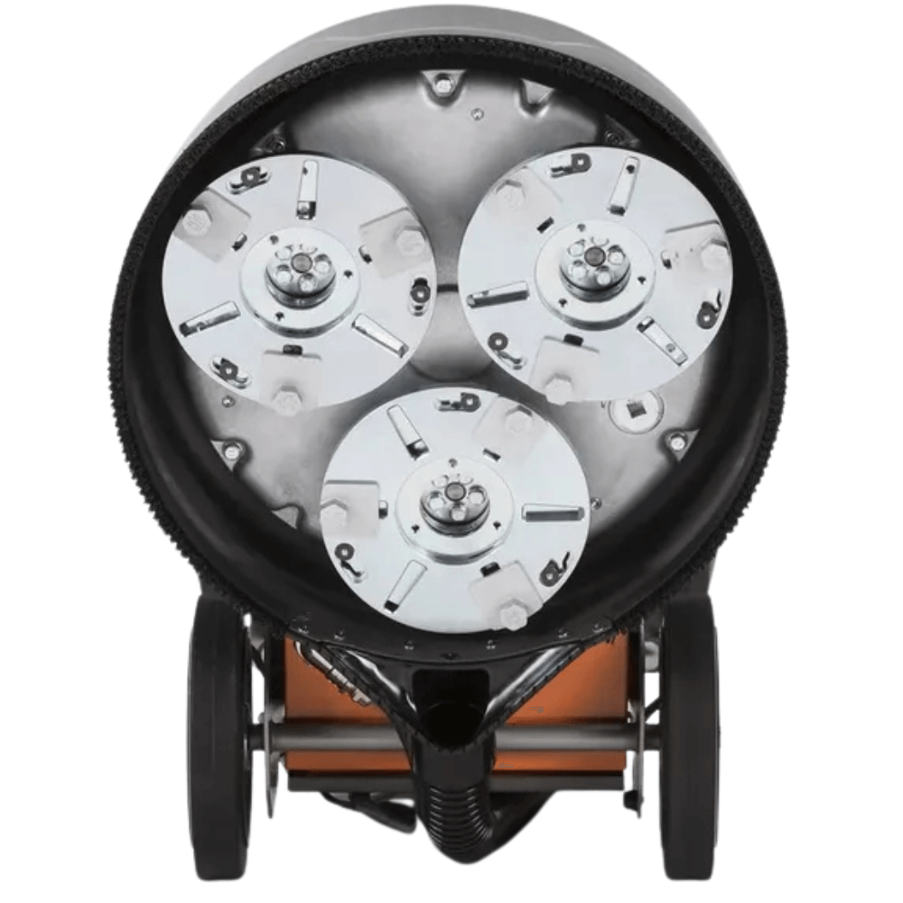 Szlifierka podłogowa Husqvarna PG 540 to profesjonalne urządzenie planetarne przeznaczone do mniejszych prac przy posadzkach betonowych i kamiennych. Wyposażona w silnik 2,2 kW, trzy tarcze szlifierskie i szerokość roboczą 515 mm zapewnia wysoką wydajność przy minimalnym zapyleniu dzięki samoregulującej, szczotkowej osłonie. Urządzenie oferuje regulowany nacisk szlifowania i ergonomiczny uchwyt, co zwiększa komfort pracy operatora. Pyłoszczelna skrzynka elektryczna chroni elektronikę, a system Redi Lock umożliwia szybką wymianę narzędzi diamentowych. Konstrukcja dzielona ułatwia transport i dopasowanie do standardowych samochodów. PG 540 sprawdza się idealnie przy przygotowaniu podłoża, szlifowaniu i polerowaniu, gwarantując trwałość i niezawodność w codziennych pracach posadzkarskich.