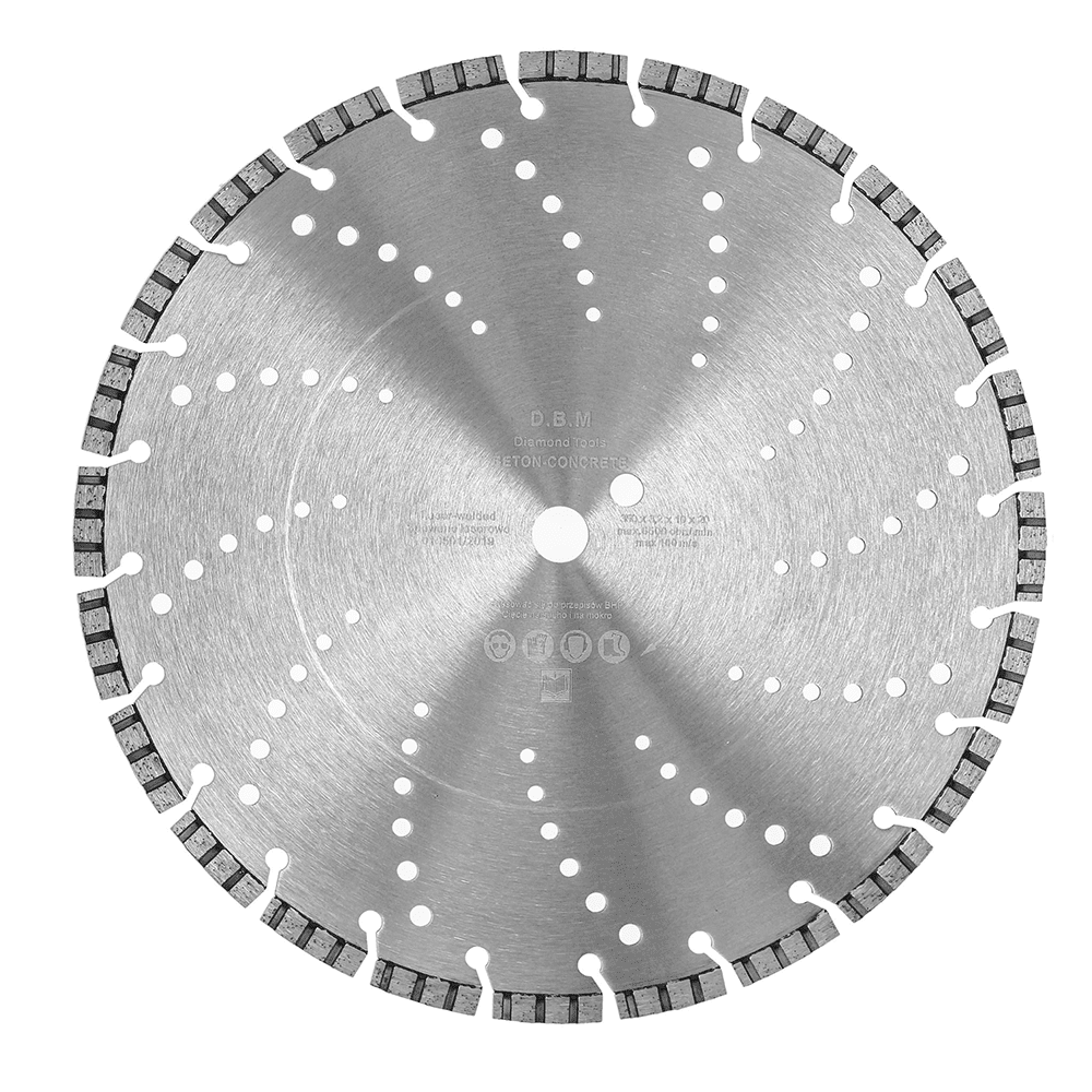 Tarcza diamentowa do Betonu Turbo 350×20.00×10 DBM Tools to solidne narzędzie do cięcia betonu i betonu zbrojonego. Turbo segmenty spawane laserowo i otwory chłodzące zwiększają trwałość oraz stabilność pracy. Idealna do profesjonalnych zastosowań, zarówno na mokro, jak i na sucho.