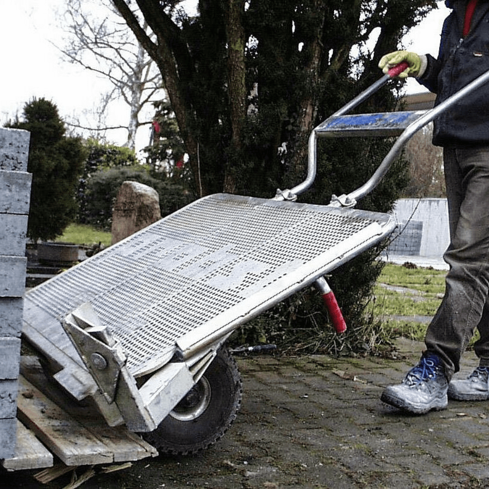 Wózek transportowy VTK-V ułatwia przenoszenie kostki brukowej i innych materiałów budowlanych dzięki regulowanej szerokości chwytu. Lekka konstrukcja i zintegrowane zabezpieczenia gwarantują bezpieczną i efektywną pracę na małych i dużych placach budowy.